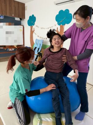 端座位の取り組みは、バランスボールやベッドを使って、それぞれに合わせて行っています。